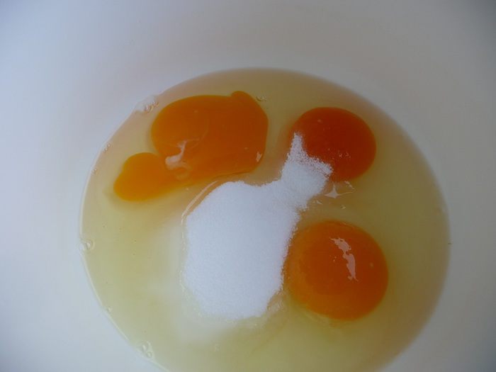 Яйца, соль, сахар, ванильный сахар взбить венчиком или миксером.