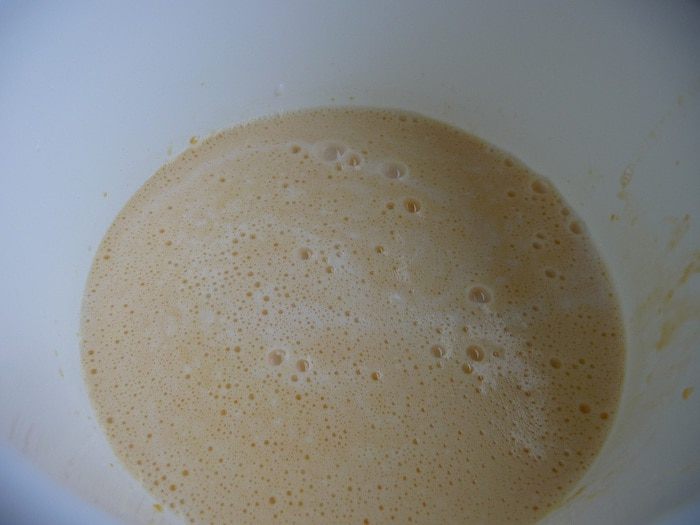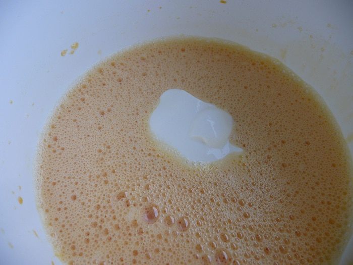 Добавить кефир и молоко, все перемешать.