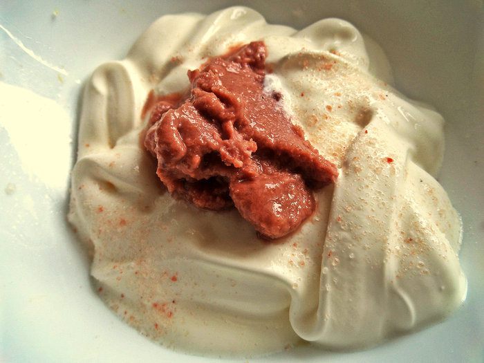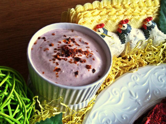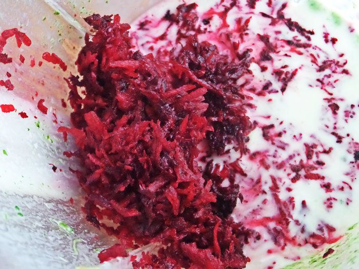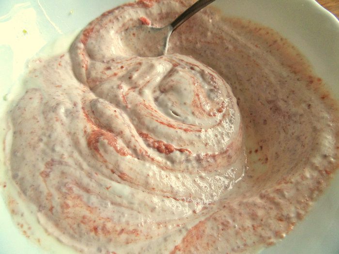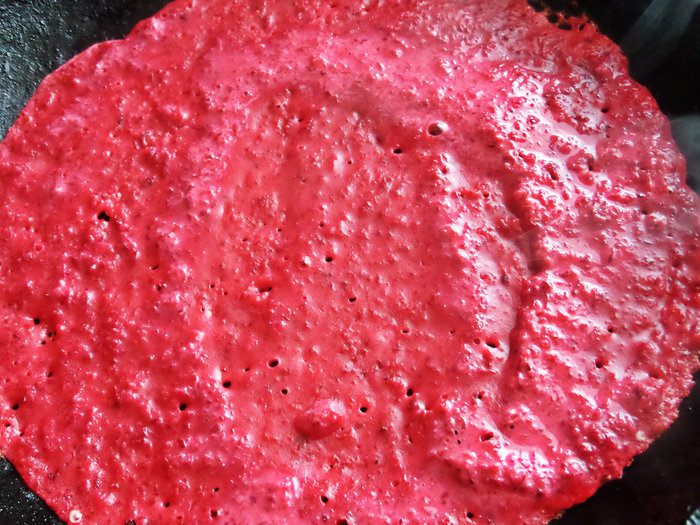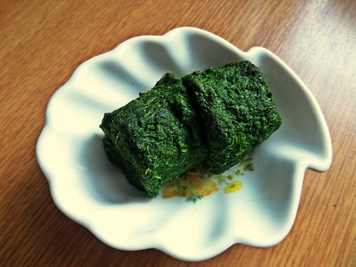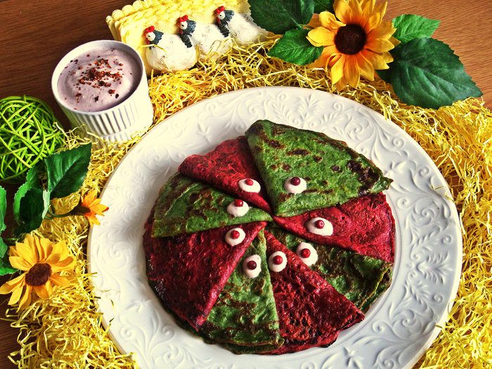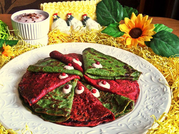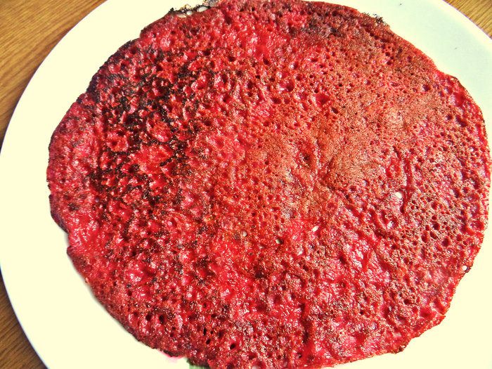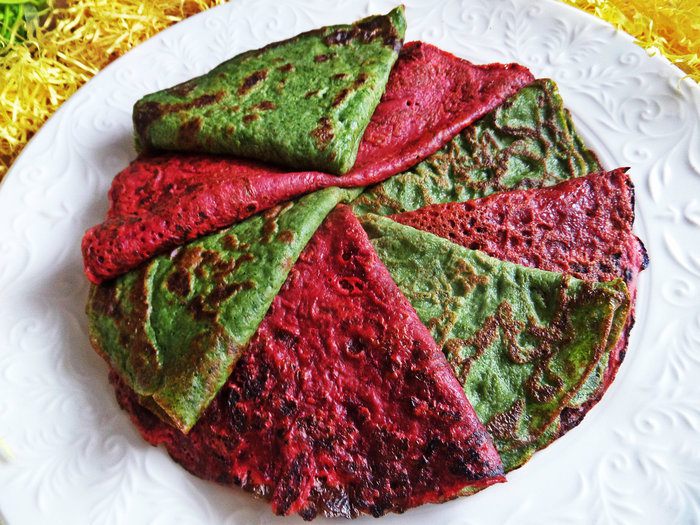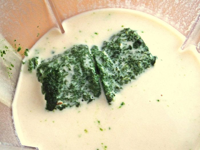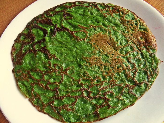 Затем взбиваем обычной блинное тесто, примерно такое, я всегда беру все "на глаз". Не удивляйтесь, что в овощных присутствует сахар и ваниль, они не помешают! Я даже в мясные блинчики это добавляю. Отливаем половину взбитого в блендере теста, в остальное добавим размороженный шпинат.