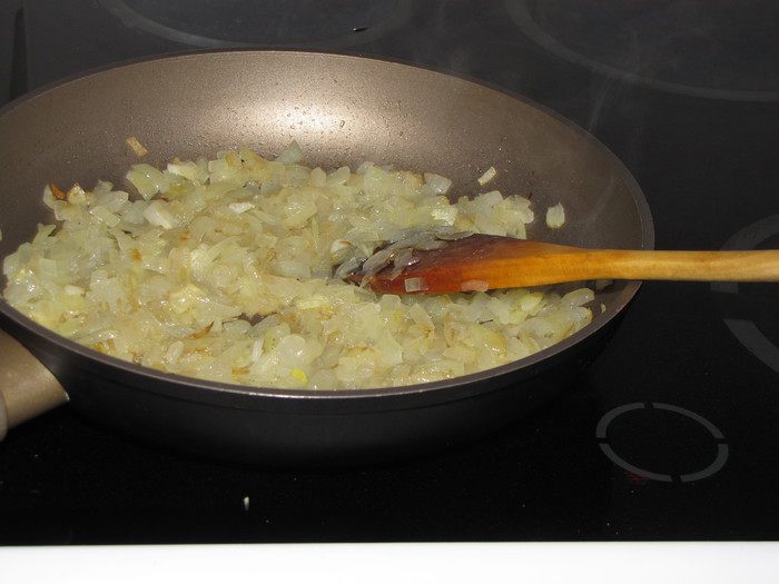 Для начинки лук измельчить и обжарить на растительном масле до золотистого цвета 10 минут.
