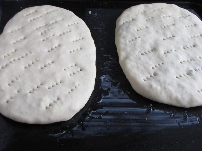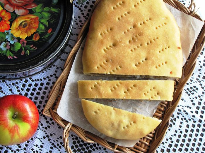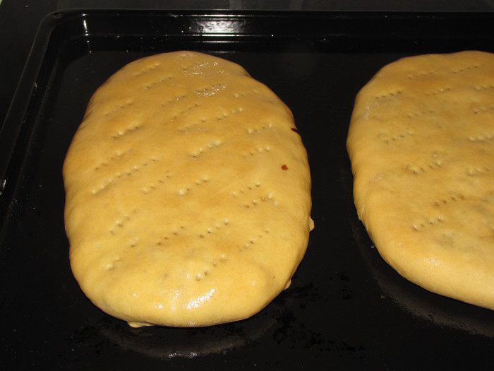 Закрыть второй частью теста и защипать края. Можно приготовить один большой или два пирога поменьше. Выложить пироги на смазанный маслом противень, наколоть вилкой для выхода пара и оставить на некоторое время.