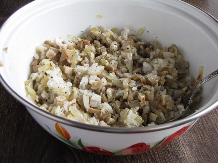Смешать в миске лук, грибы, отварной рис. Посолить и поперчить по вкусу. Начинка готова.