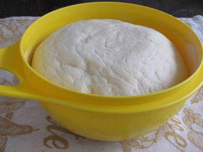 Затем добавить масло, соль, сахар и оставшуюся муку. Вымешивать, пока тесто не будет отставать от рук, если нужно подпылять мукой. Оставить тесто для подъема на 3-4 часа. За это время тесто дважды обмять.
