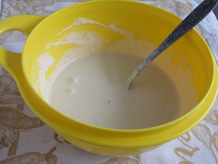 Растворить дрожжи в теплой воде и добавить половину просеянной муки. Замесить опару.
