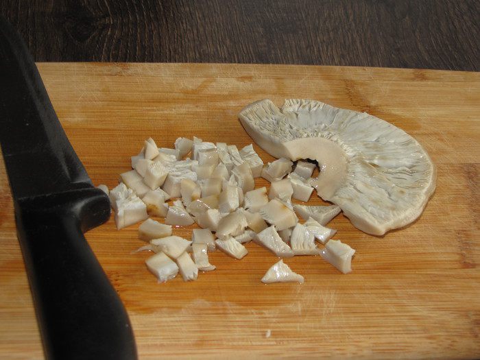 Соленые грибы мелко нарезать.