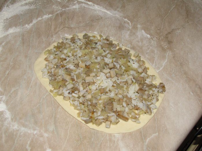 Разделить тесто на две части раскатать в овал, выложить начинку.