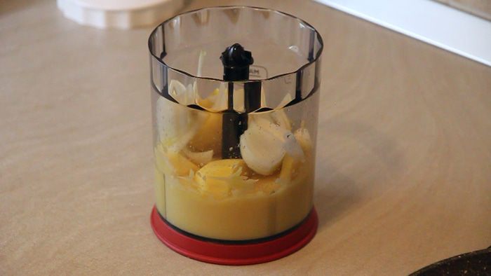 Кладем в блендер часть картофеля и оставшуюся половину луковицы. Все измельчаем.
