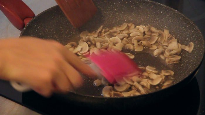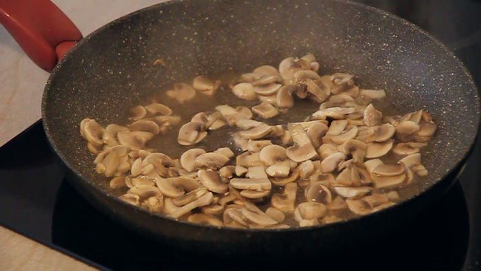 На полученном масле обжариваем порезанные грибы до появления легкой золотистой корочки.