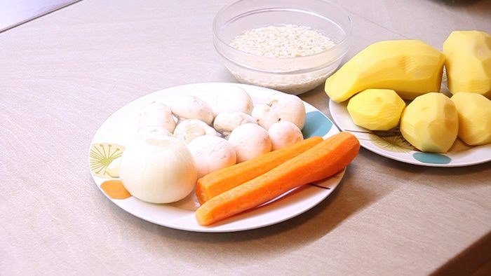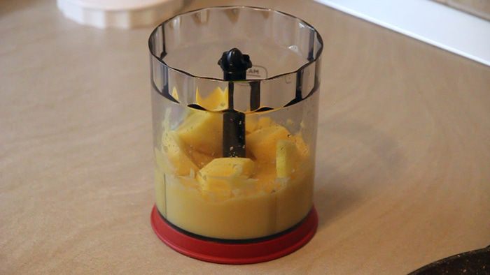 Добавляем в блендер запаренную заранее овсянку, оставшийся картофель и содержимое сковороды. Все измельчаем блендером.