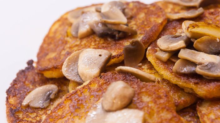 Готовые «бризольки» выкладываем на тарелку и украшаем отложенными заранее поджаренными грибочками.