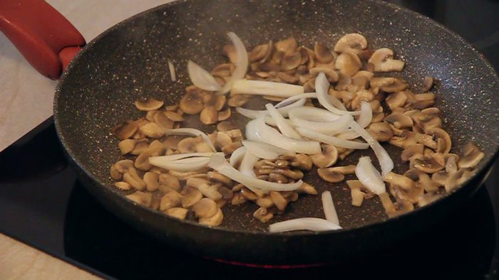 Добавляем к грибам произвольно нарезанную половинку луковицы. Все обжариваем 2 минуты, постоянно помешивая.