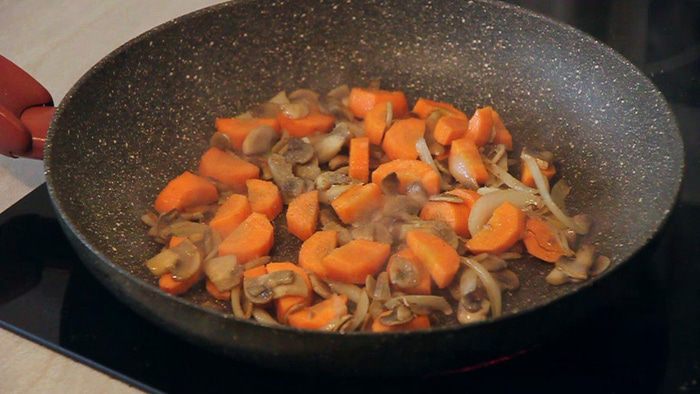 Добавляем так же произвольно нарезанную морковь и обжариваем 2 минуты. Постоянно помешиваем. Можно немножко подсолить.