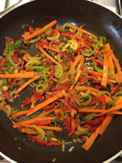 Овощи порезать,добавить 1 ст. л. соевого соуса и потушить на оливковом масле.