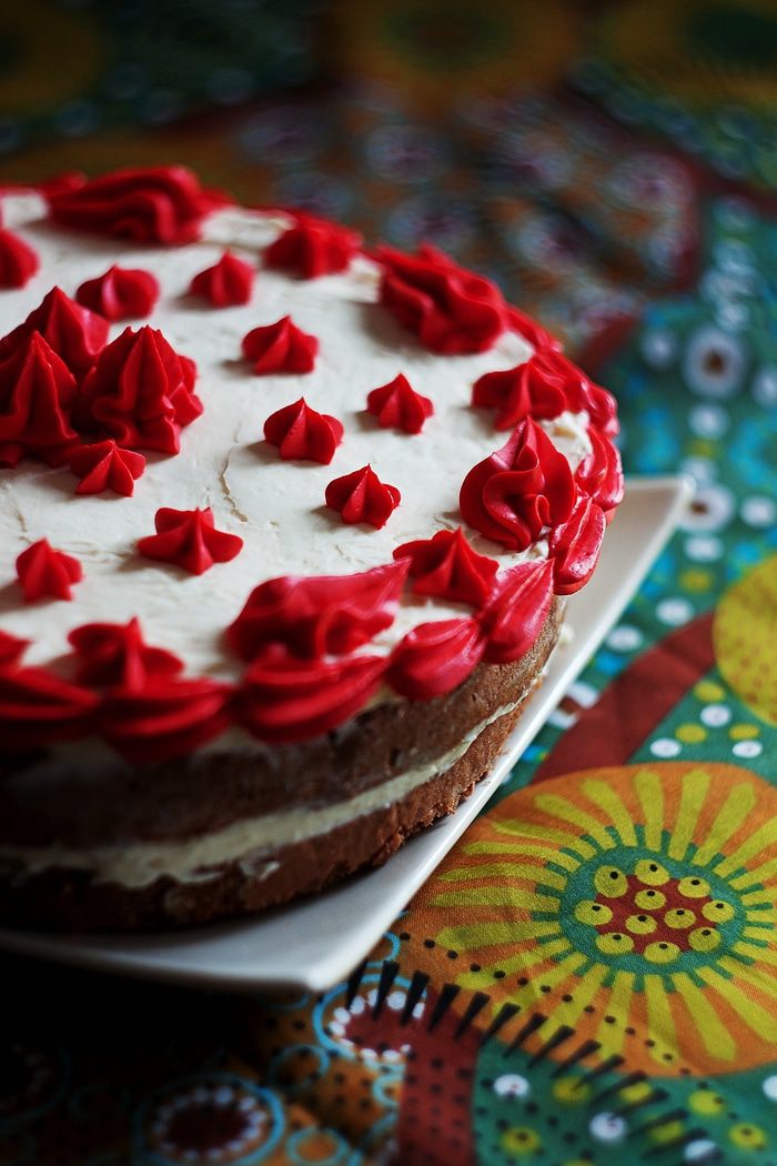 Разделить яйца на белки и желтки. Желтки взбить с 2/3 сахара до тягучей почти белой массы. Отдельно взбить белки в крепкую пену, добавить оставшийся сахар, взбивать еще минуту. Смешать желтки и белки, аккуратно перемешать. Добавить муку, просеянную вместе с какао, и снова аккуратно и тщательно перемешать, но не долго, чтобы тесто не осело. Вылить тесто в смазанную маслом и присыпанную мукой форму, выпекать 25 минут при 200°С. Готовый бисквит остудить 10 минут в форме, затем вынуть и перевернуть на решетку.