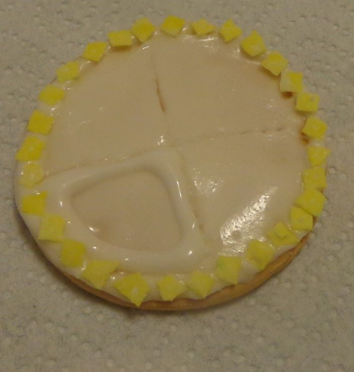 Начать решила с малых форм. На печенье нанесла тонкий слой айсинга и начала работу. Но оказалось, что я работала недостаточно быстро и айсинг застыл скорее, чем я закончила. Пришлось дополнительно наносить айсинг на остальную часть картинки и в итоге центр оказался "проваленным".
