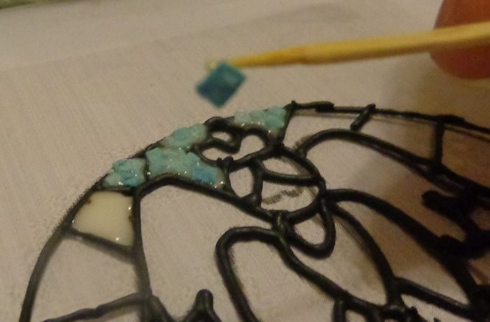 Потом стала по частям заполнять рисунок подходящими цветами. Кстати, очень удобно работать с помощью тонкой зубочистки, ею легко подцеплять "камушки".