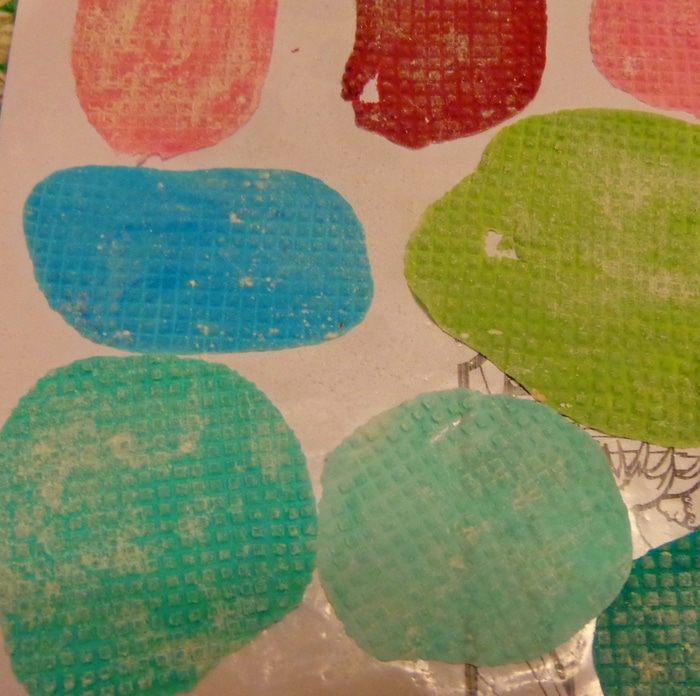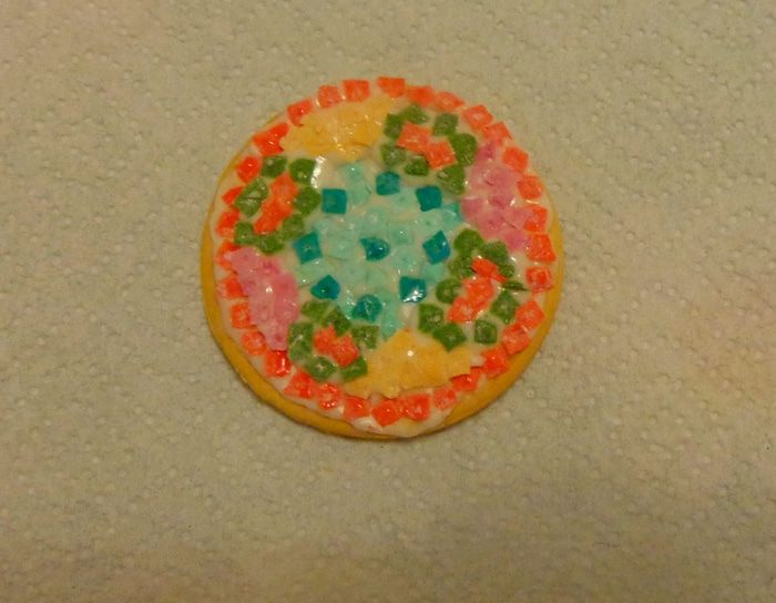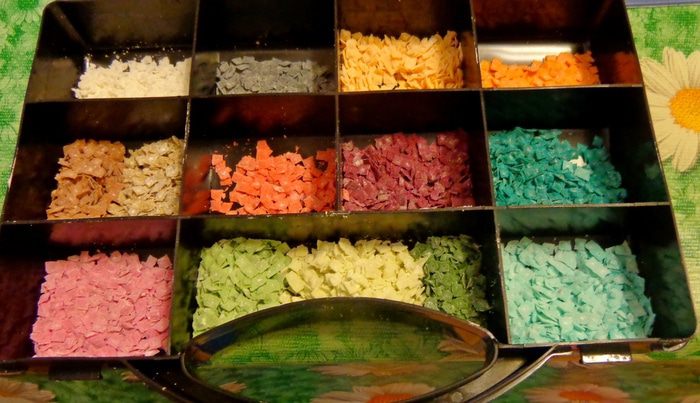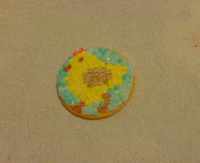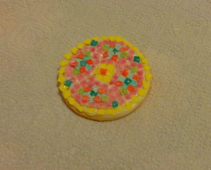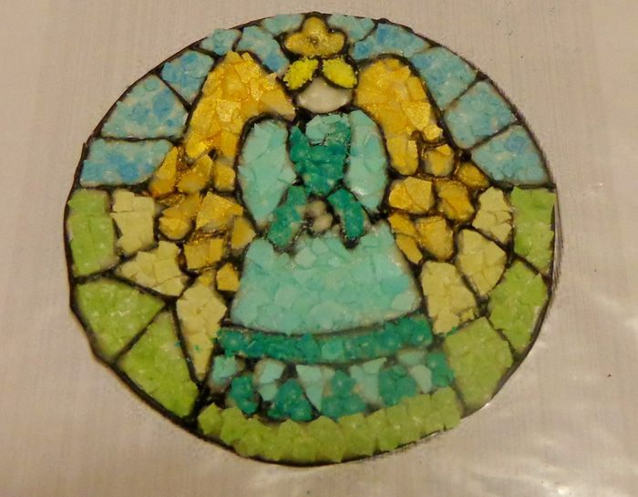 Первое, что надо было сделать, это материал для мозаики. Я попробовала сначала мастику: окрасила ее в разные цвета, тонко раскатала и с помощью канвы для вышивки сделала "камушки". Потом высушила и измельчила.