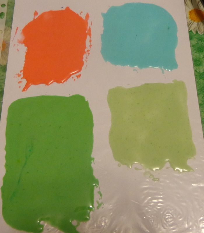 Также попробовала айсинг: окрасила в разные цвета, сделала его довольно жидким и ножом нанесла тонкий слой на полиэтиленовый файл. После высыхания измельчила.