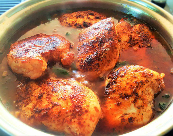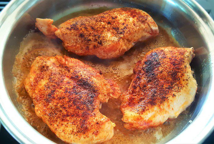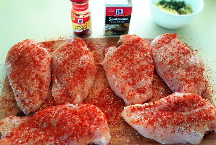 Куриные грудки обсушите тщательно бумажным полотенцем, затем щедро их посолите, поперчите и посыпьте паприкой с обеих сторон. Я в своем рецепте использовала подкопченные черный перец и паприку, они придают блюду необыкновенный аромат. Но, конечно же, можно использовать и классику.