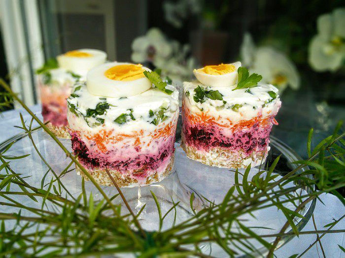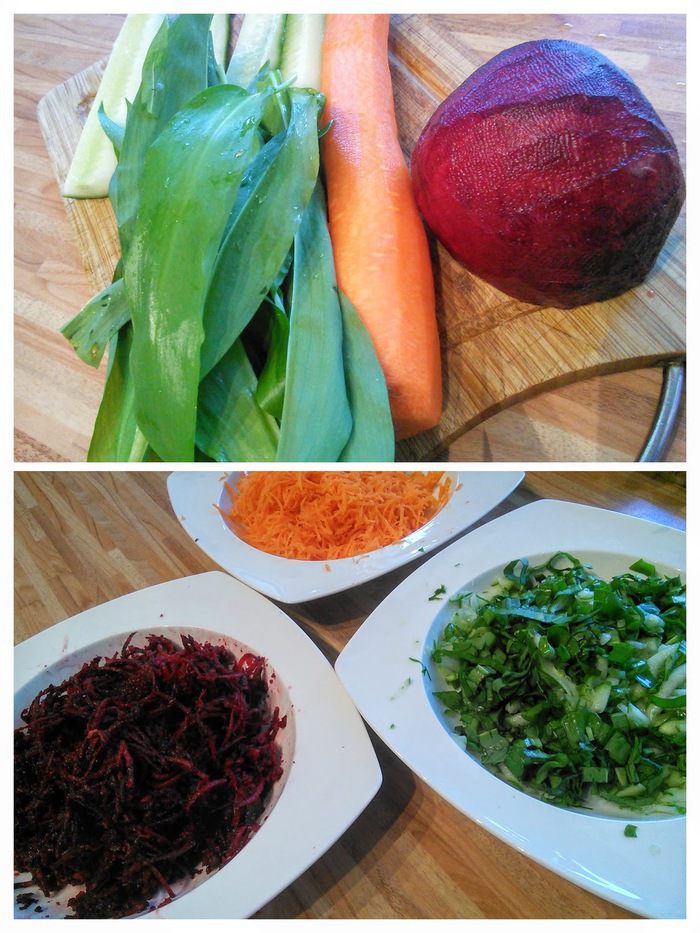* заменила редиску свеклой, а цукини огурцом и пучком черемши. Овощи могут быть самые разнообразные, желательно не слишком водянистые, но главное выдержать цветовую гамму.