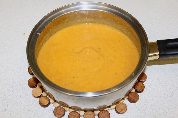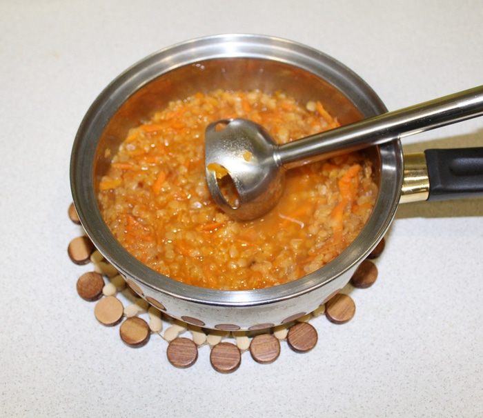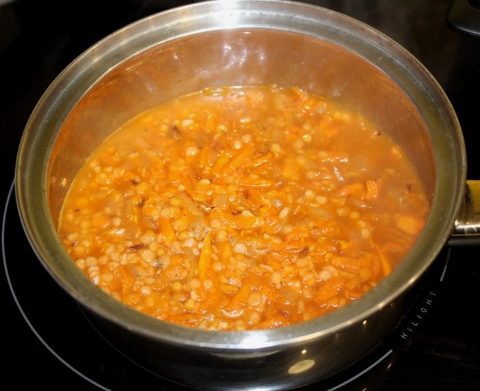 Вливаем бульон, добавляем чечевицу, солим по вкусу и доводим до кипения. Уменьшаем огонь до минимума и варим суп до мягкости чечевицы, около 20-25 минут.