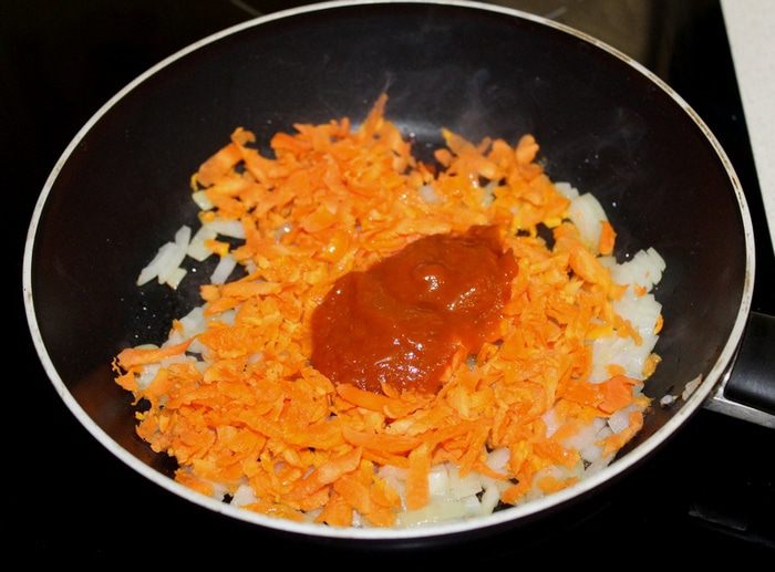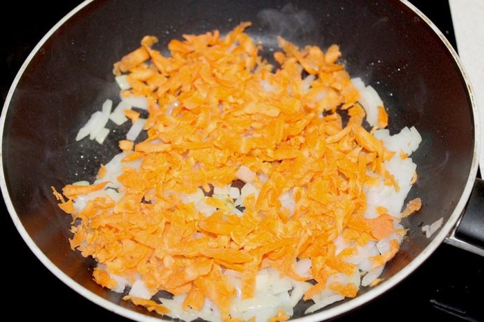 Лук и чеснок мелко нарезать. На среднем огне разогреваем 2 ст.л. оливкового масла. Кладем лук и чеснок и жарим, помешивая, до полупрозрачного состояния, около 4-5 минут. Затем добавляем натертую на крупной терке морковь. Потушить еще 3 минуты.