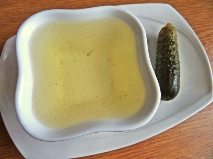 Процеживаем из банки рассол. Можно взять капустный.
