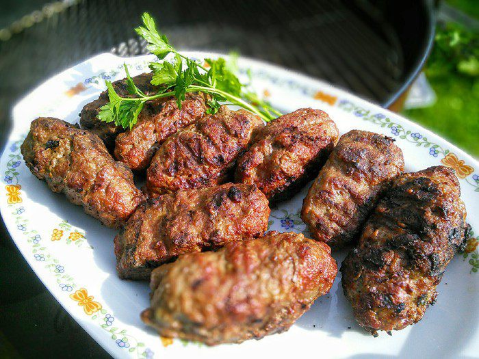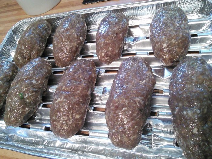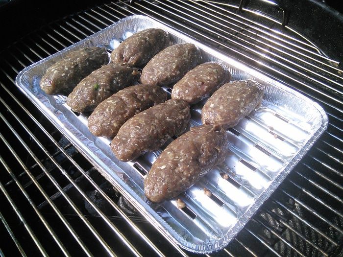Сформировать "колбаски", для этого смачивать руки водой. Люля можно надеть на шпажки или шампура, я оставила все как есть. Так же можно люля жарить на сковороде, а можно взять с собой на пикник и приготовить на гриле. Очень удобно выложить люля на специальный поддон, который нужно предварительно смазать маслом.