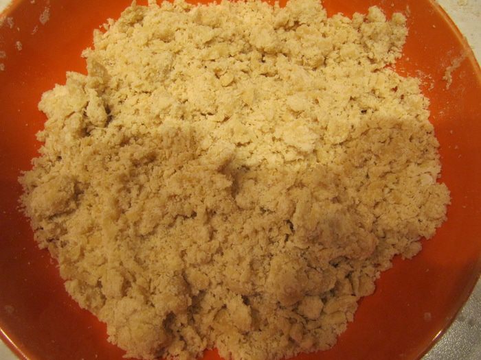 85 г теста отложить для посыпки. Смешать его с помощью вилки с дополнительной мукой до состояния крошки. Убрать в холодильник, пока занимаетесь яблоками.