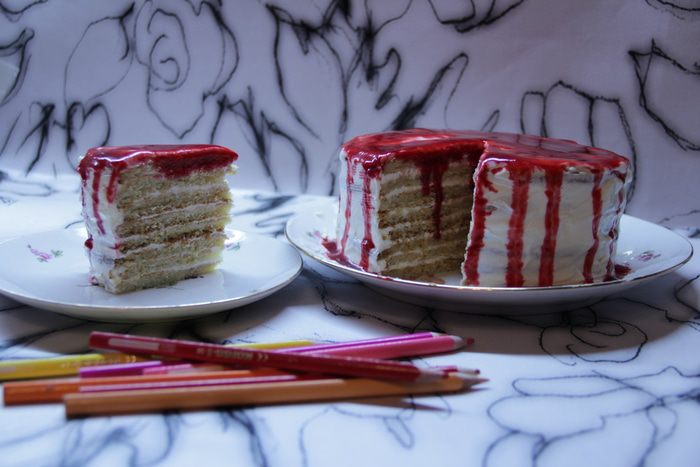Укладываем в форму коржи, щедро заливая каждый из них сметанным кремом( 3 — 4 ст. л.). Пару ст. ложек крема можно оставить для финального оформления торта.