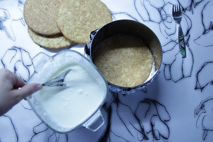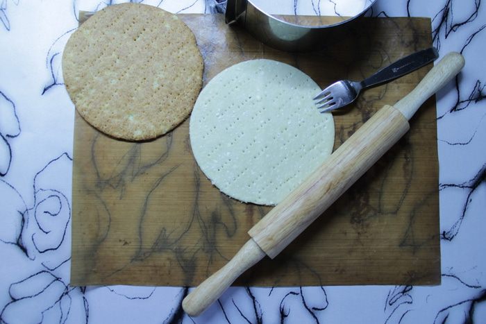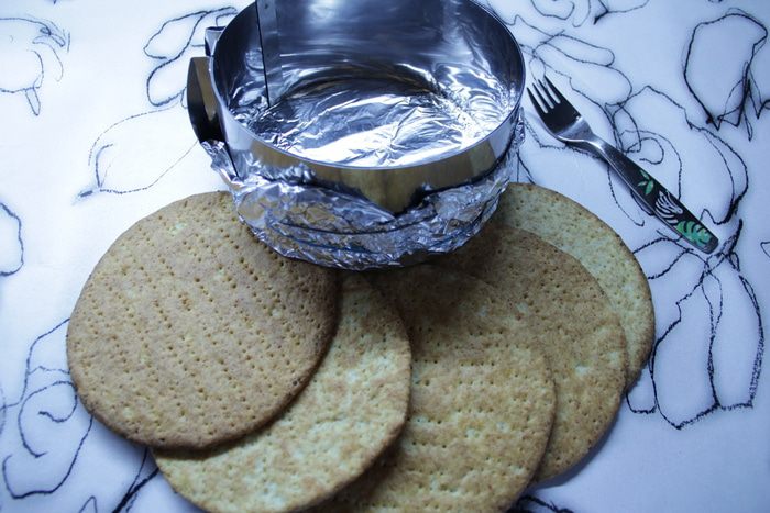 Раскатать кусочек теста толщиной около 3 — 4 мм, вырезать кольцом круг, наколоть вилкой. Выпекать в духовом шкафу при 180°С до подрумянивания. Так поступить со всеми коржами.