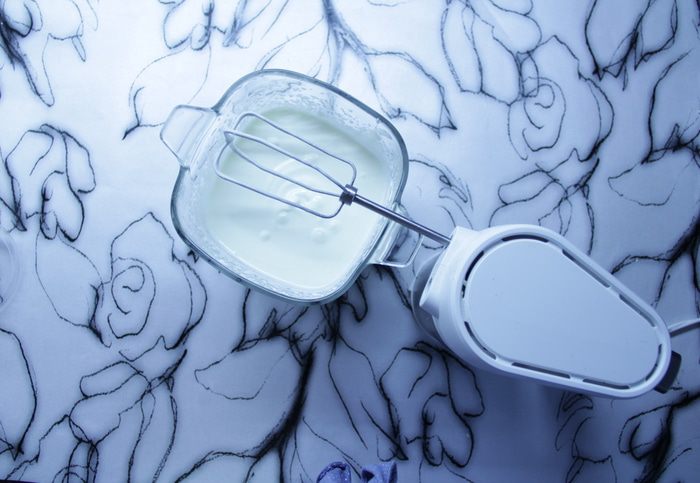 Взбить сметану (580 г) с сахаром (100 г).
