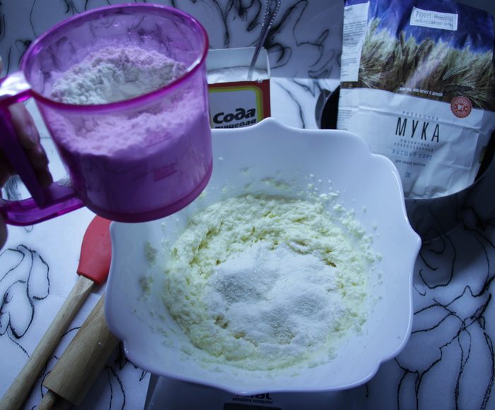 Всыпать в творожную смесь всю муку с содой и замесить миксером.
