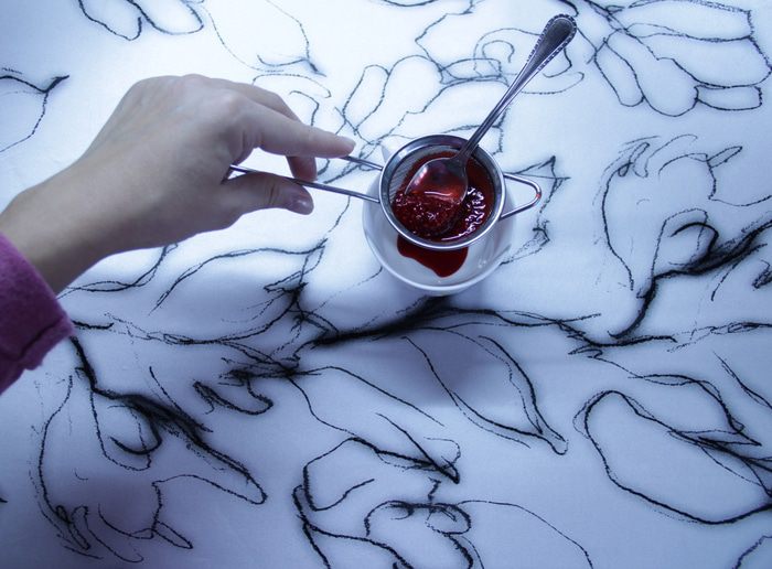 Процедить малиновое варенье через ситечко, чтобы удалить все косточки.