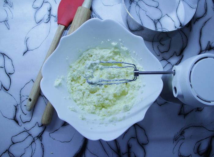 Взбить миксером в миске творог, сахар (50 г), сметану (20 г) и сливочное масло.