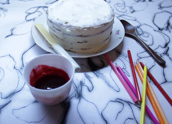 Достать торт из холодильника, аккуратно снять кольцо, выравнить крем по поверхности и бокам торта.