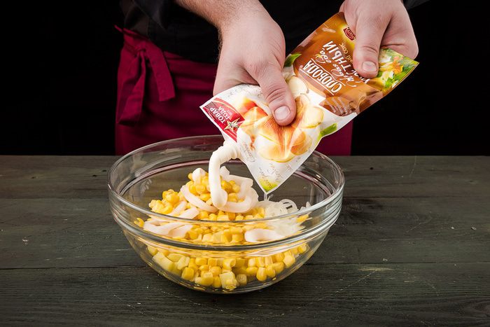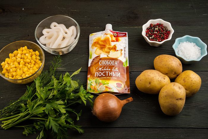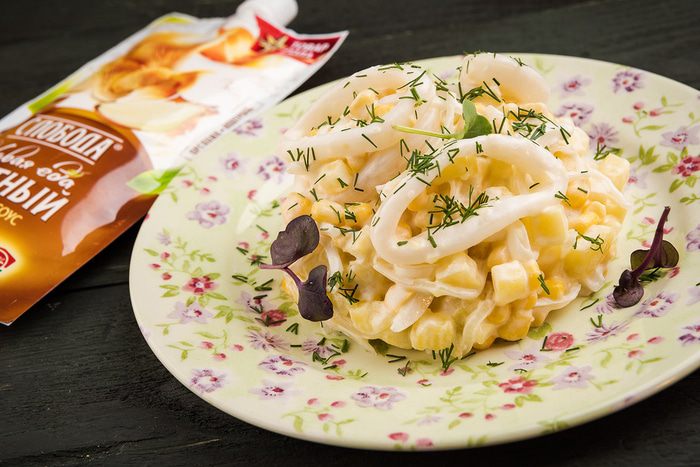 В салатник выложить картофель, сверху — кальмары и лук (предварительно слить воду). Далее выкладываем кукурузу, добавляем специи по вкусу.