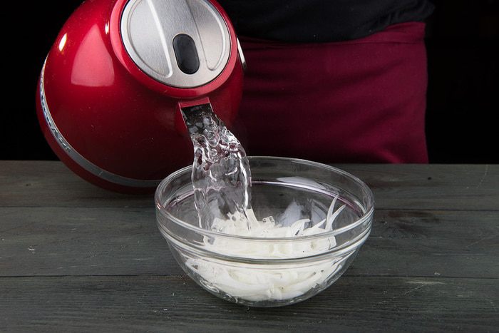 Лук нарезать полукольцами и залить кипятком, чтобы вышла горечь. Картофель очистить и отварить. Нарезать кубиками.