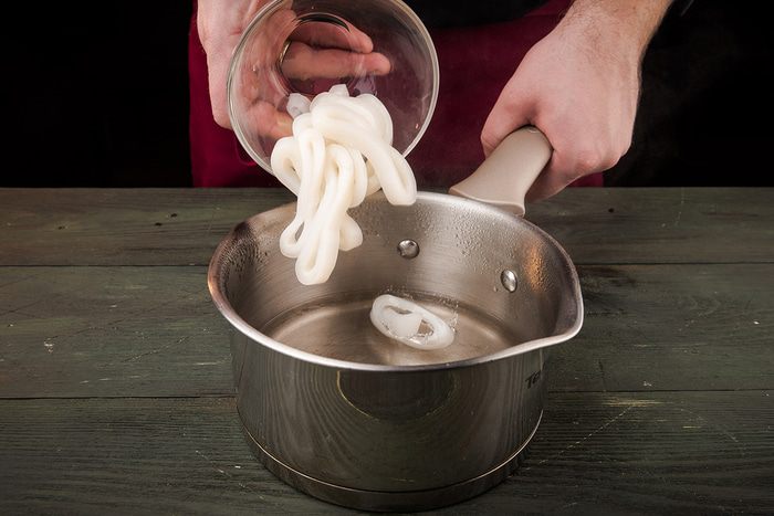 Кальмары отварить 3 минуты в подсоленной воде. Нарезать колечками.