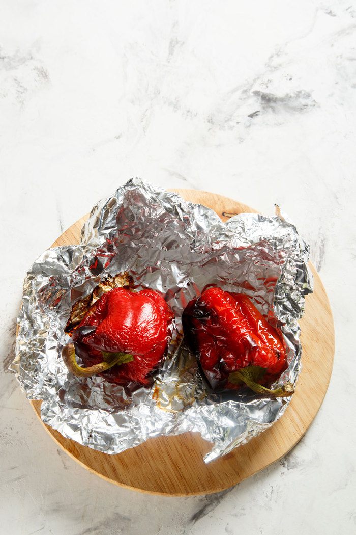 Подготовить соус: 2 болгарских перца обжарить на гриле до черных подпалин. Готовые перцы положить в пакет, завязать и оставить на несколько минут.