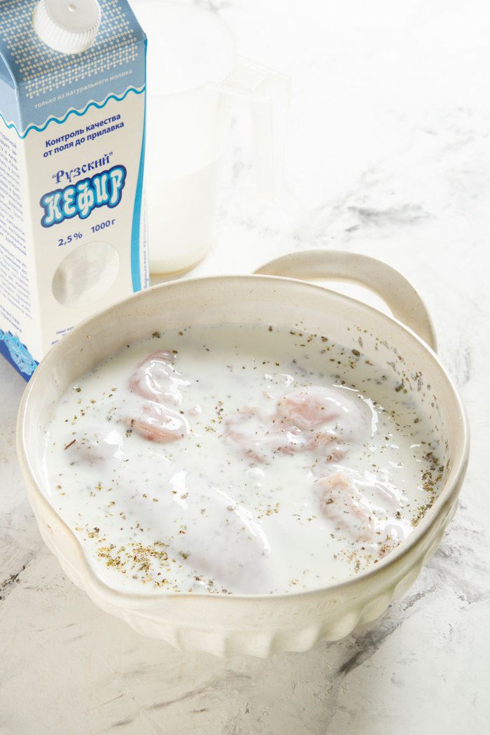 Куриное филе положить в миску. Добавить кефир, майоран, соль и перец. Хорошо перемешать, накрыть пленкой и убрать в холодильник на несколько часов.