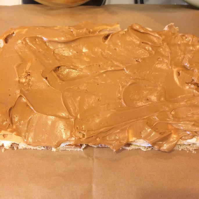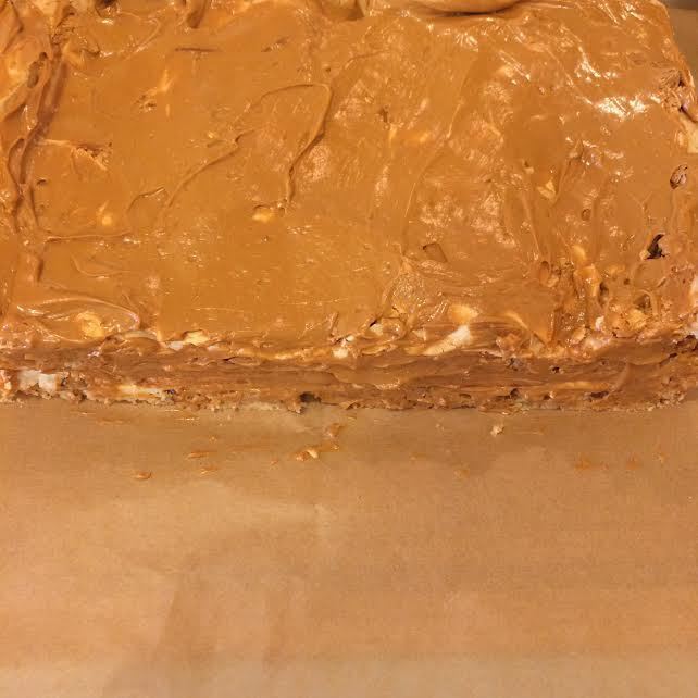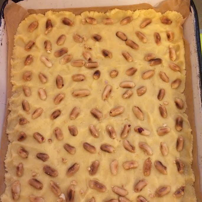 Духовку нагреть до 170°С. Форму 25*30 застелить бумагой для выпечки и распределить тесто. Сверху распределить арахис, слегка вдавив его в тесто. Форму с тестом отправить в холодильник.
