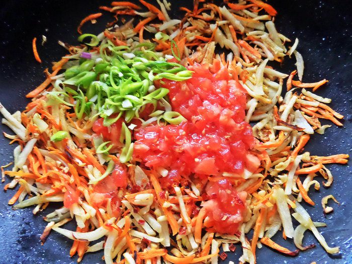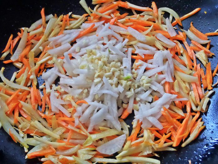 Обжариваем немного, помешивая и теперь добавляем дайкон и измельченный чеснок, перемешиваем.