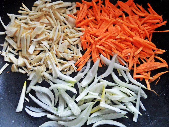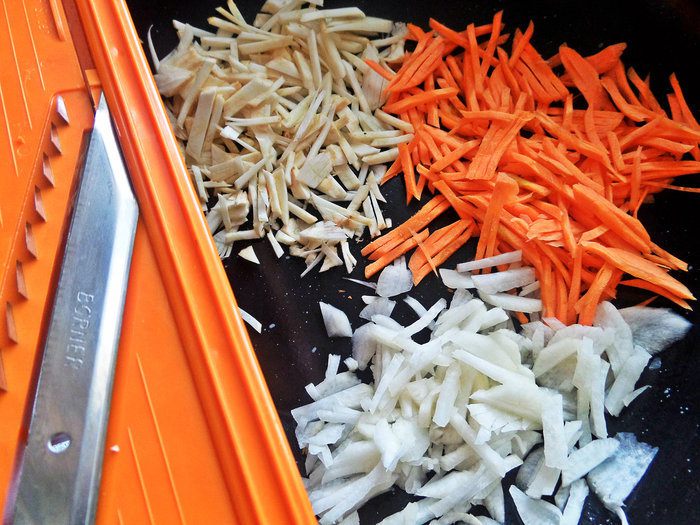 Помещаем овощи в сковороду вок. Вначале грубые коренья: морковь и сельдерей, лук, дайкон высыпала позднее, он нежнее.