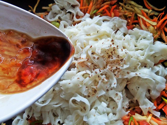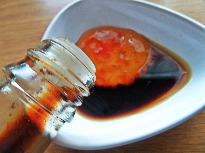 Для заправки смешать соевый соус, сладкий чили, уксус.