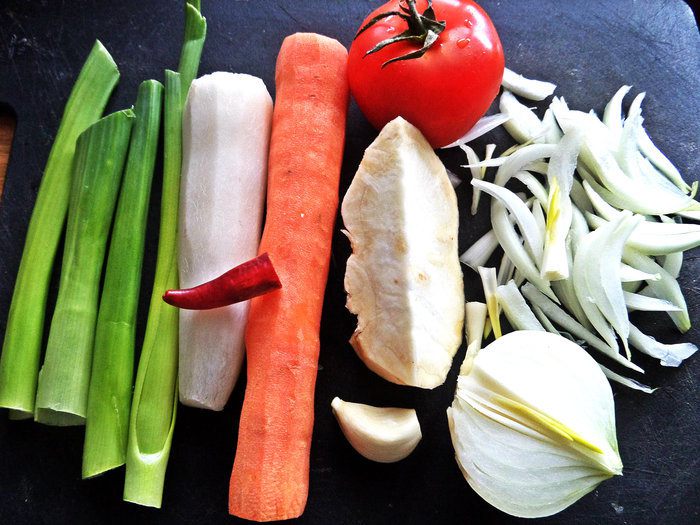 Еще через минуту добавить помидор без кожицы и половину порея с чили.