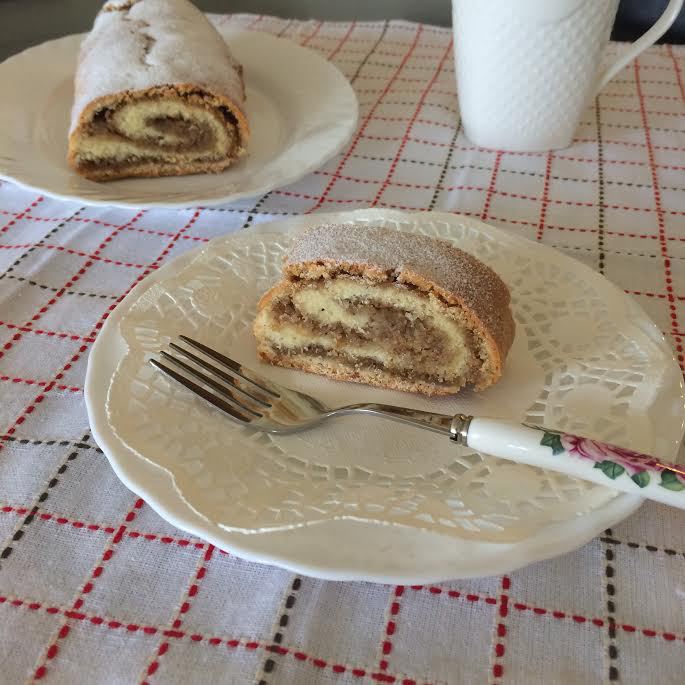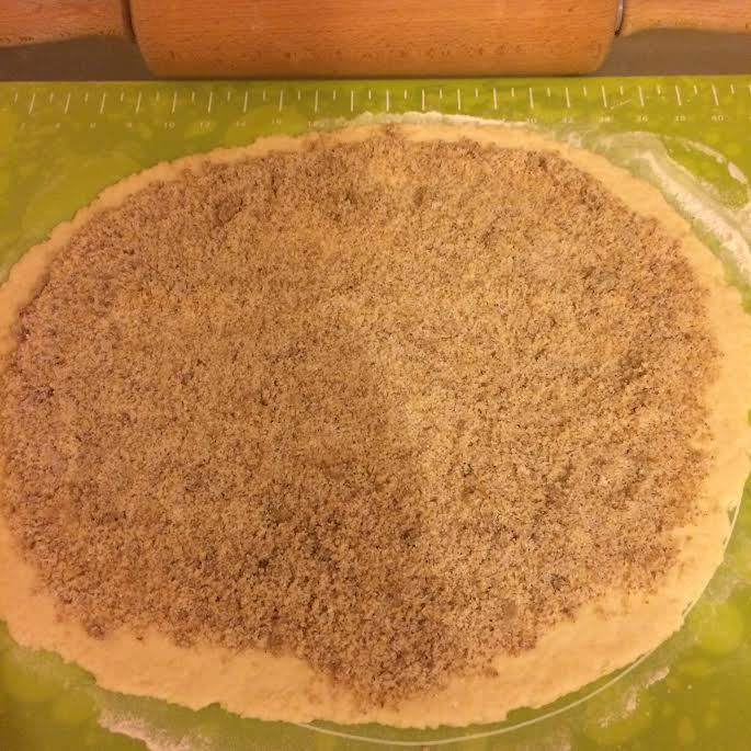 Духовку нагреть до 180°С. Тесто раскатать, выложить начинку и свернуть в рулет. Тесто получается очень нежное, поэтому работать надо быстро и аккуратно.