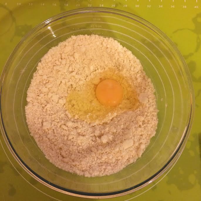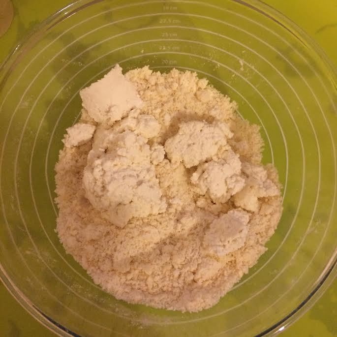 Тесто: просеять муку в миску, добавить соль, ванильный сахар, разрыхлитель, сахар и холодное сливочное масло. Перетереть все в крошку. Затем добавить риккоту и перемешать.