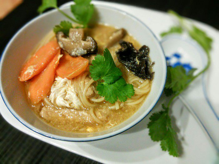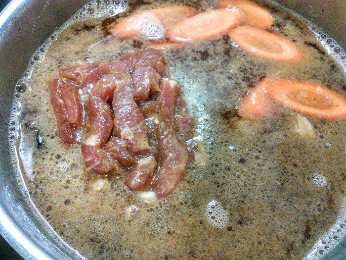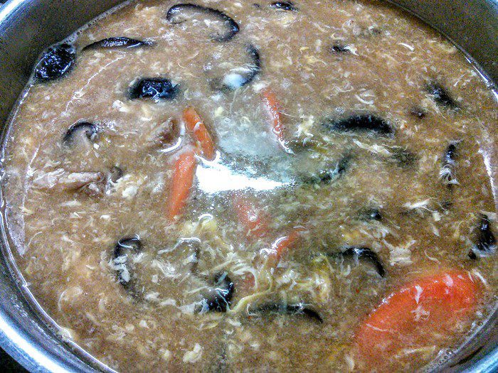 Куриный бульон довести до кипения, заправить соевым соусом, солью, перцем, уксусом и острым чили-соусом. Добавить грибы и мясо, довести до кипения. За это время мясо доходит до готовности, т. к. оно очень тонко порезано.