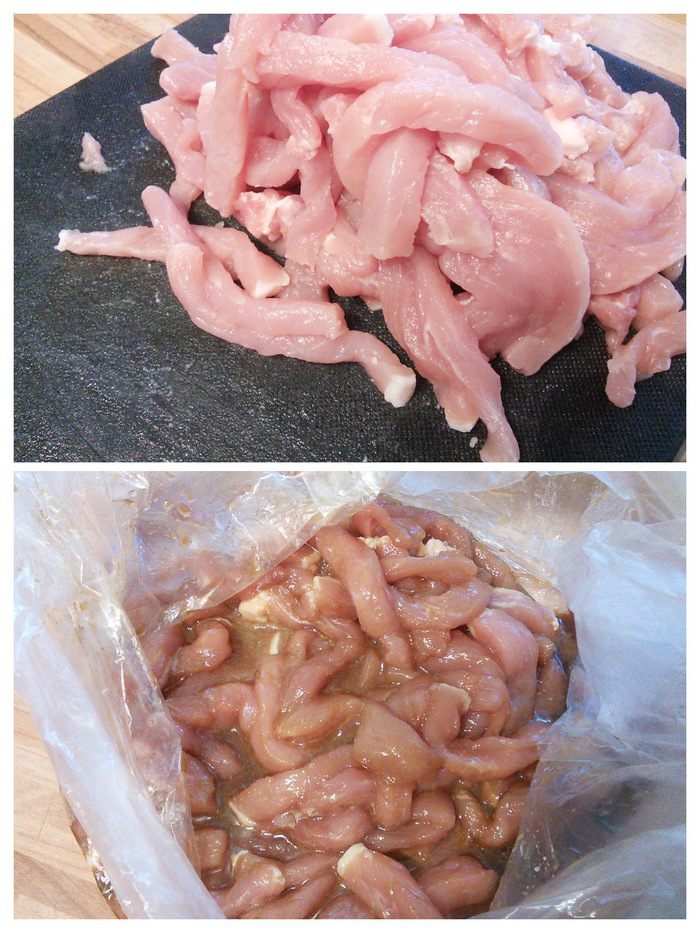 Свинину помыть, очистить от жилок, если они есть, обсушить и порезать на очень тонкие ломтики. Соединить все остальные ингредиенты для маринада и замариновать мясо на 30 мин.